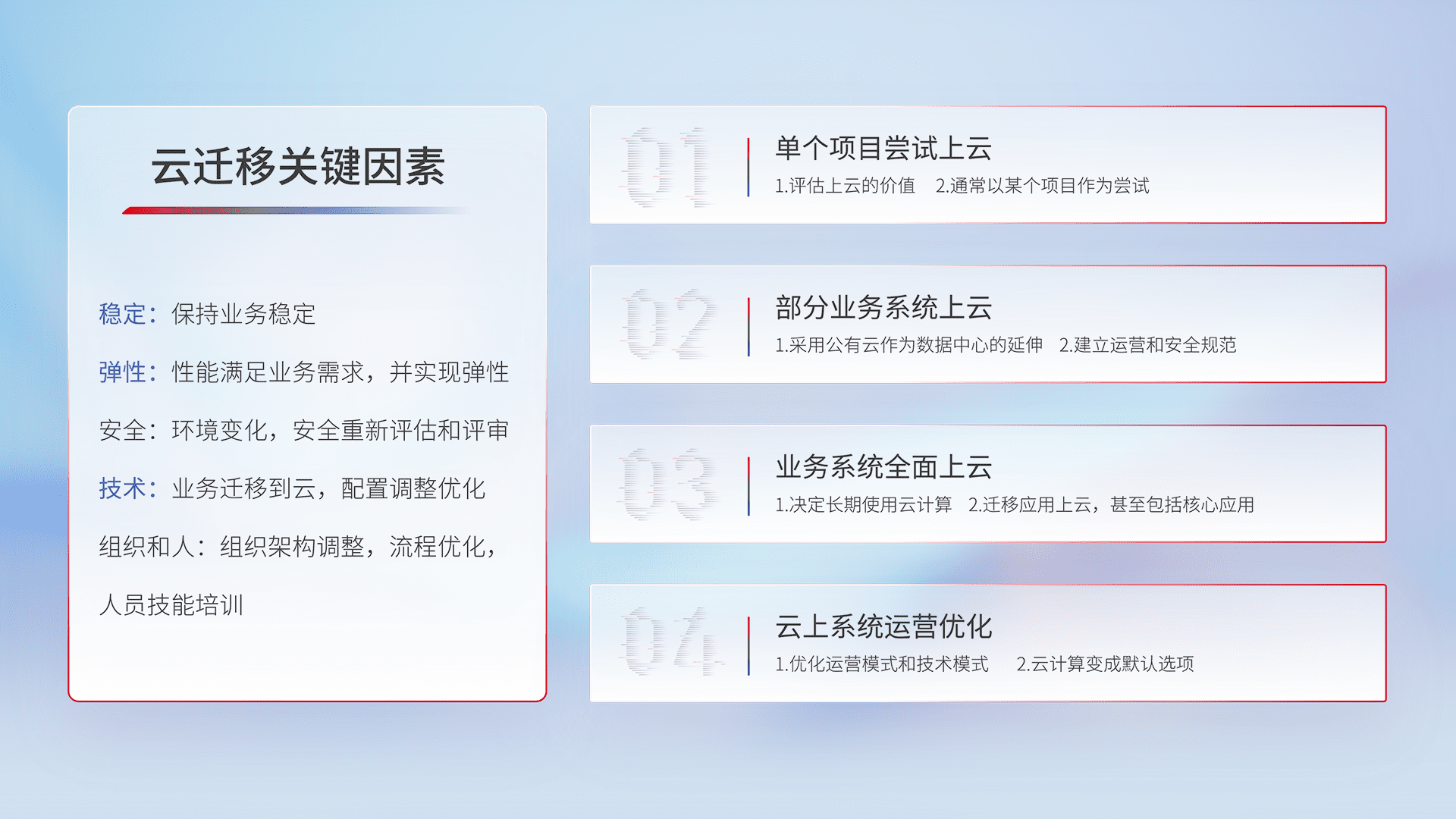 结合实际业务,,,从规划设计、、、云平台选型、、云原生改造、、、、数据迁移、、、集成交付,,迁移全过程为客户识别最佳上云路径,,做好风险识别管理,,设计网络架构、、、、身份权限、、、安全审计合规、、、、操作审计、、日志审计、、监控告警策略、、、、多站点容灾设计等,,,对云上基础设施进行整体规划,,,,提升IT治理水平,,,,以满足弹性、、、高可用、、高性能的需求。。。